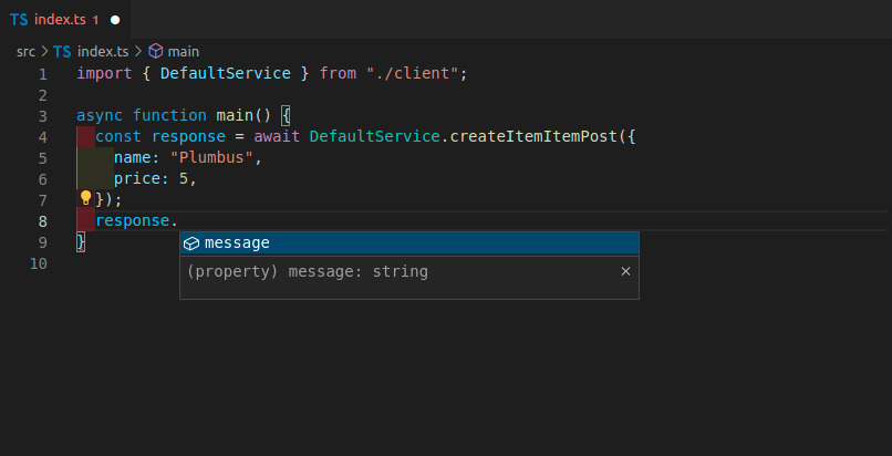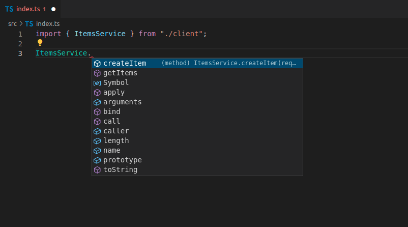 Now you can import and use the client code, it could look like this, notice that you get autocompletion for the methods: